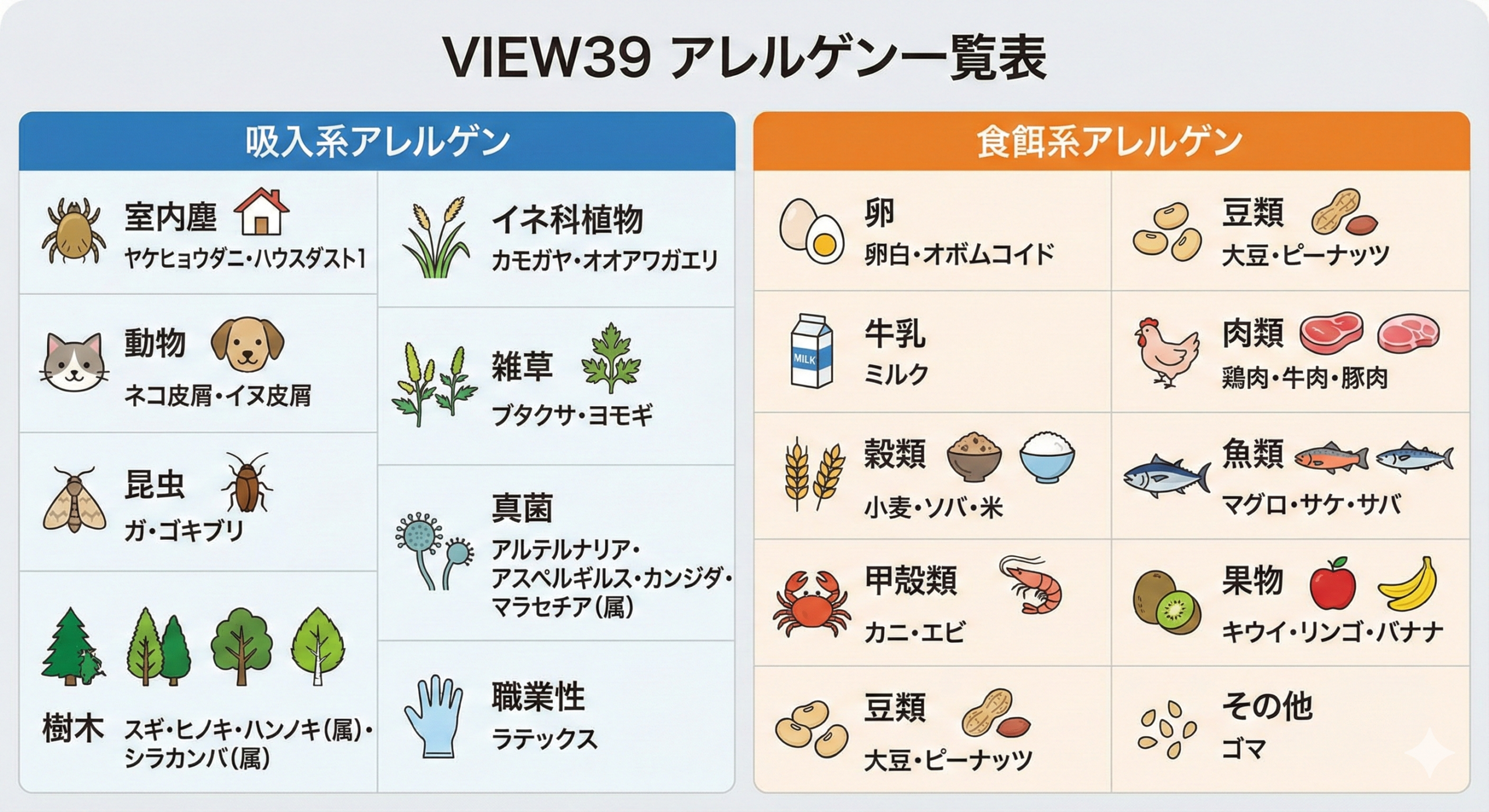 - 結果は「イネ科植物ミックス」のようにまとめられますが、その分、View39には入っていない植物(ナガハグサ、ギョウギシバなど)も成分として含まれています。「何らかのイネ科花粉に反応するか」を広く拾い上げるスクリーニング(ふるい分け)能力に長けています。